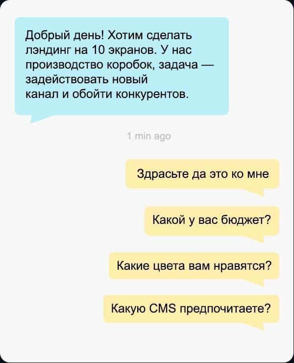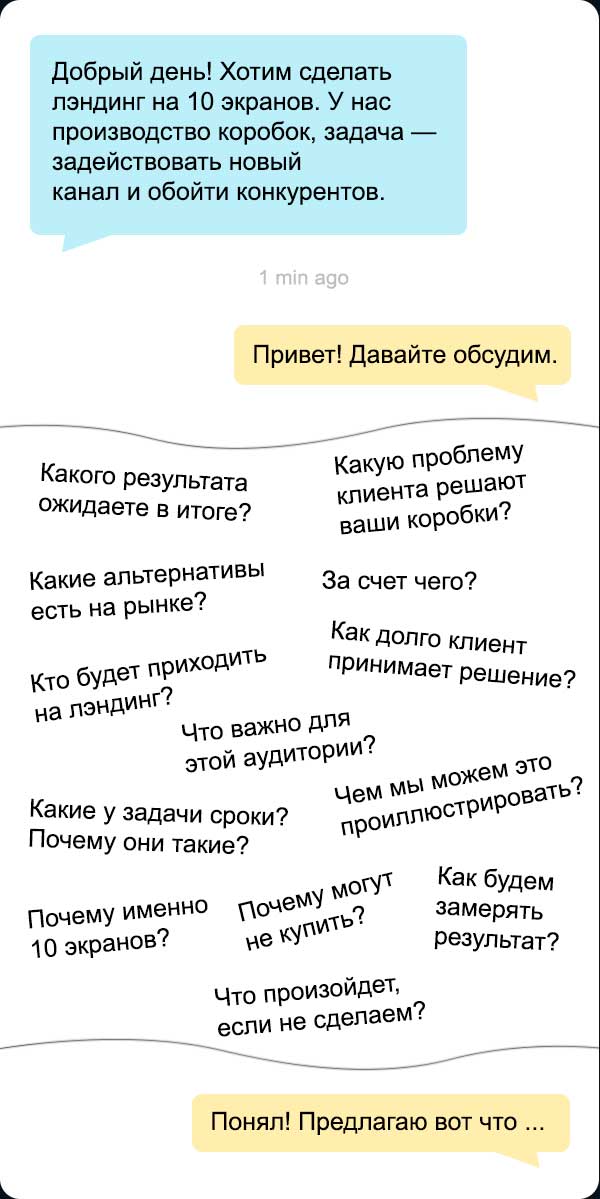 У меня нет брифов, я обсуждаю задачу на онлайн-встрече. Задаю много вопросов о проекте, аудитории, процессах, контексте и ситуации в целом. По ходу беседы набрасываю решение.